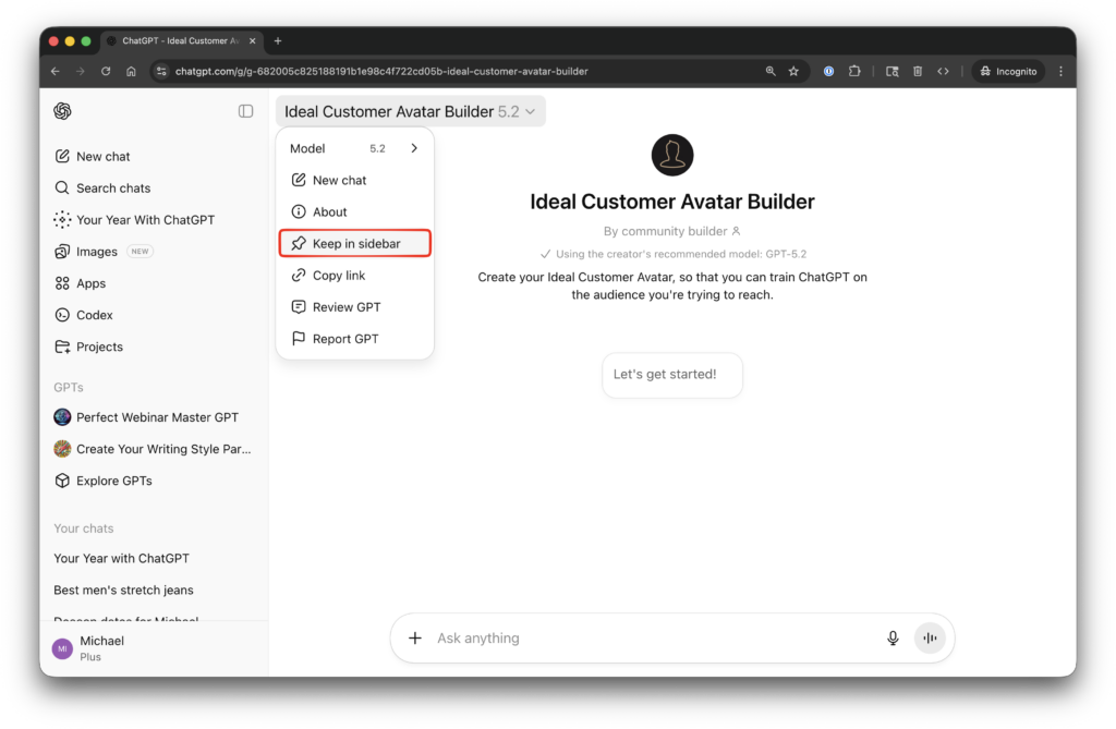 The Ideal Customer Avatar Builder is a custom GPT. You will need a Plus or Pro version of ChatGPT to use it. Here’s how to get started: